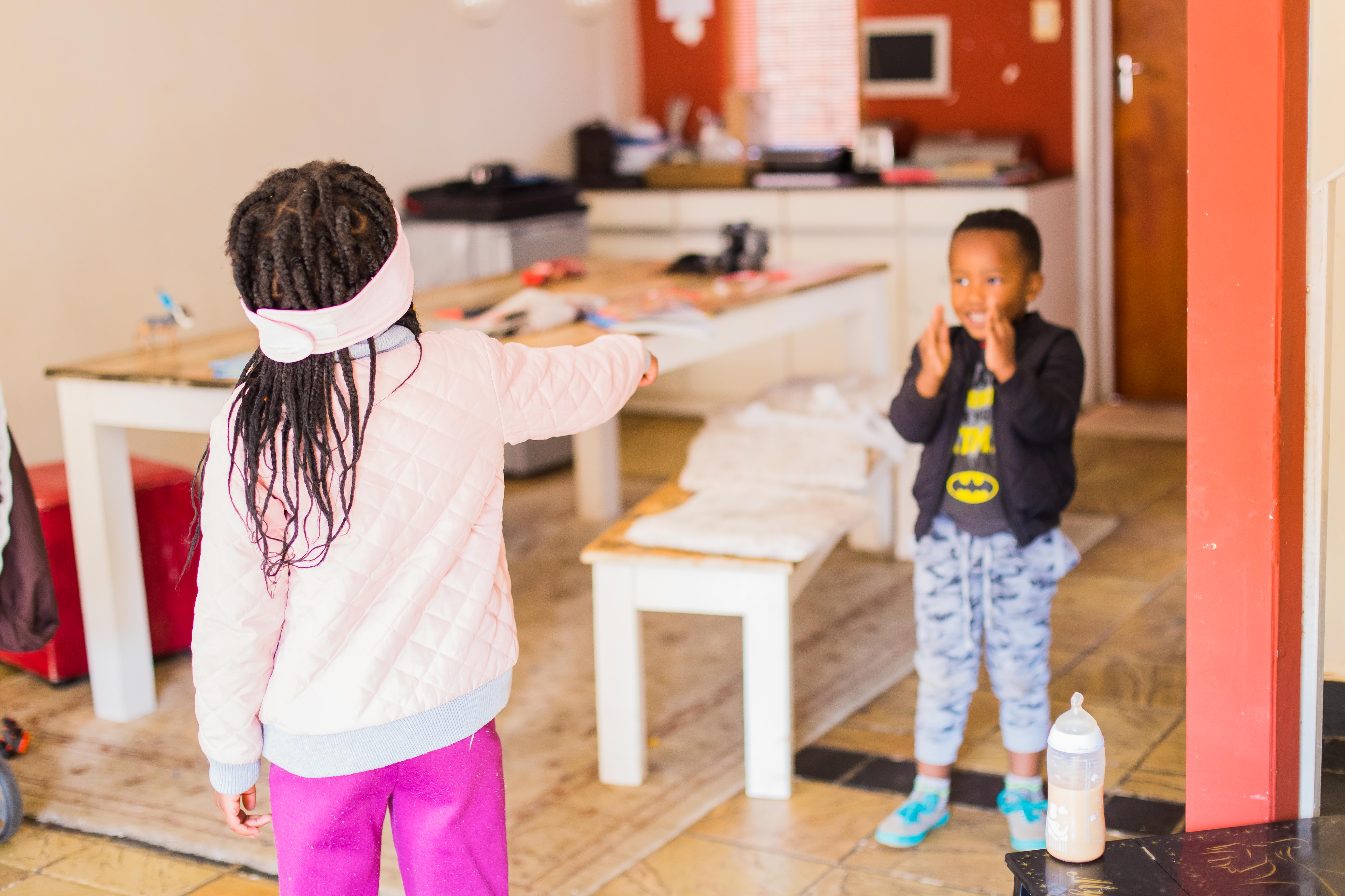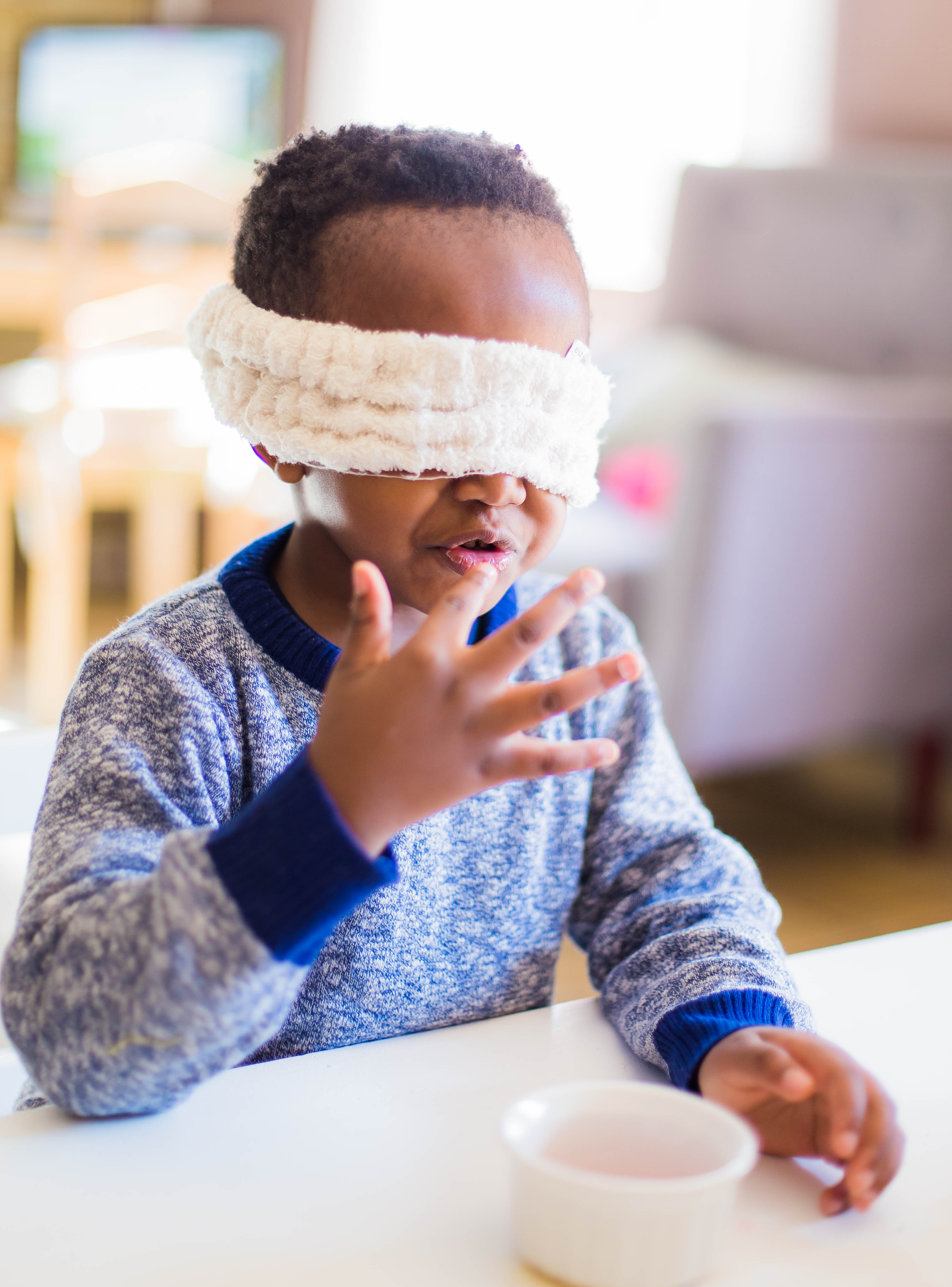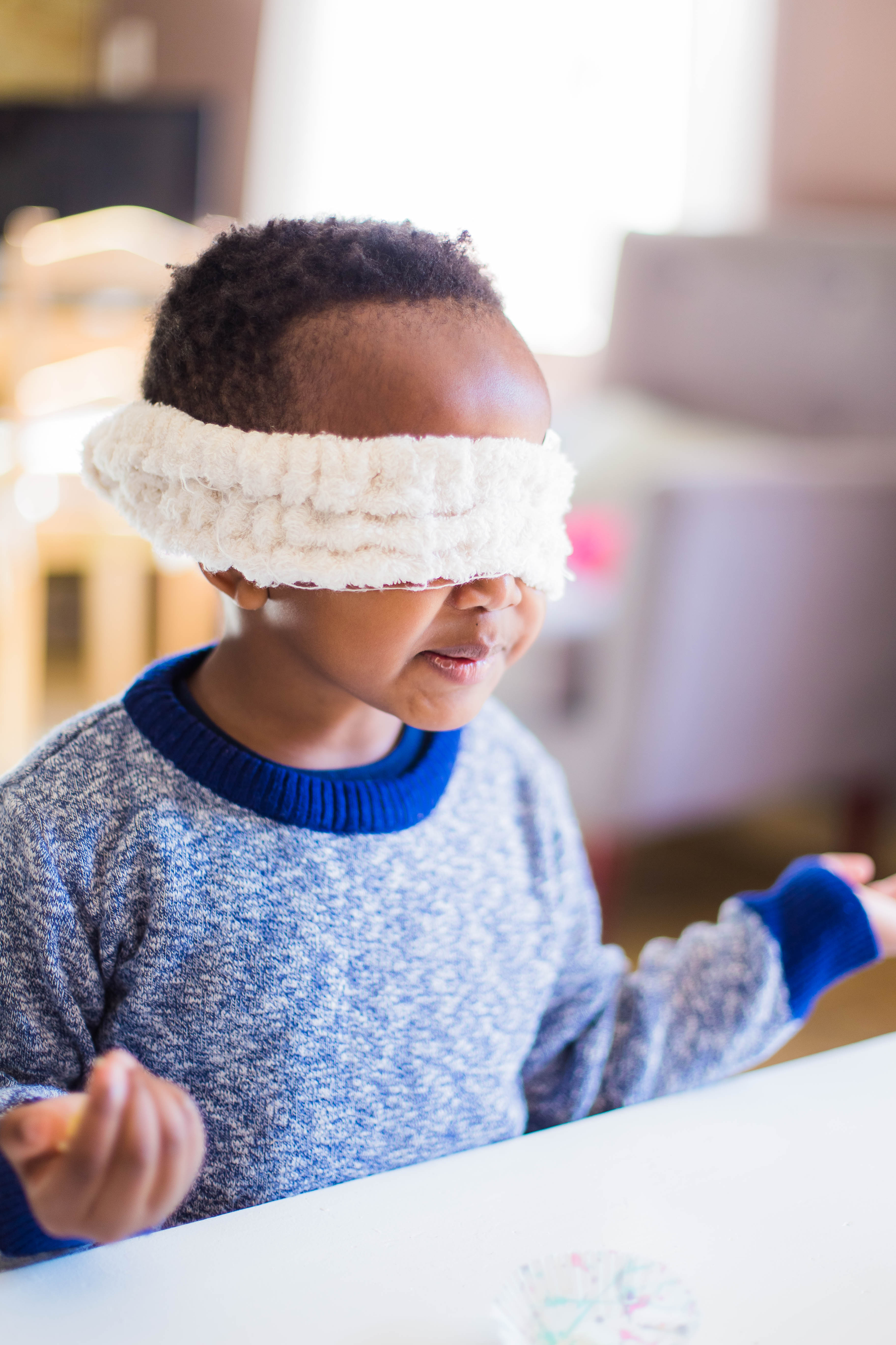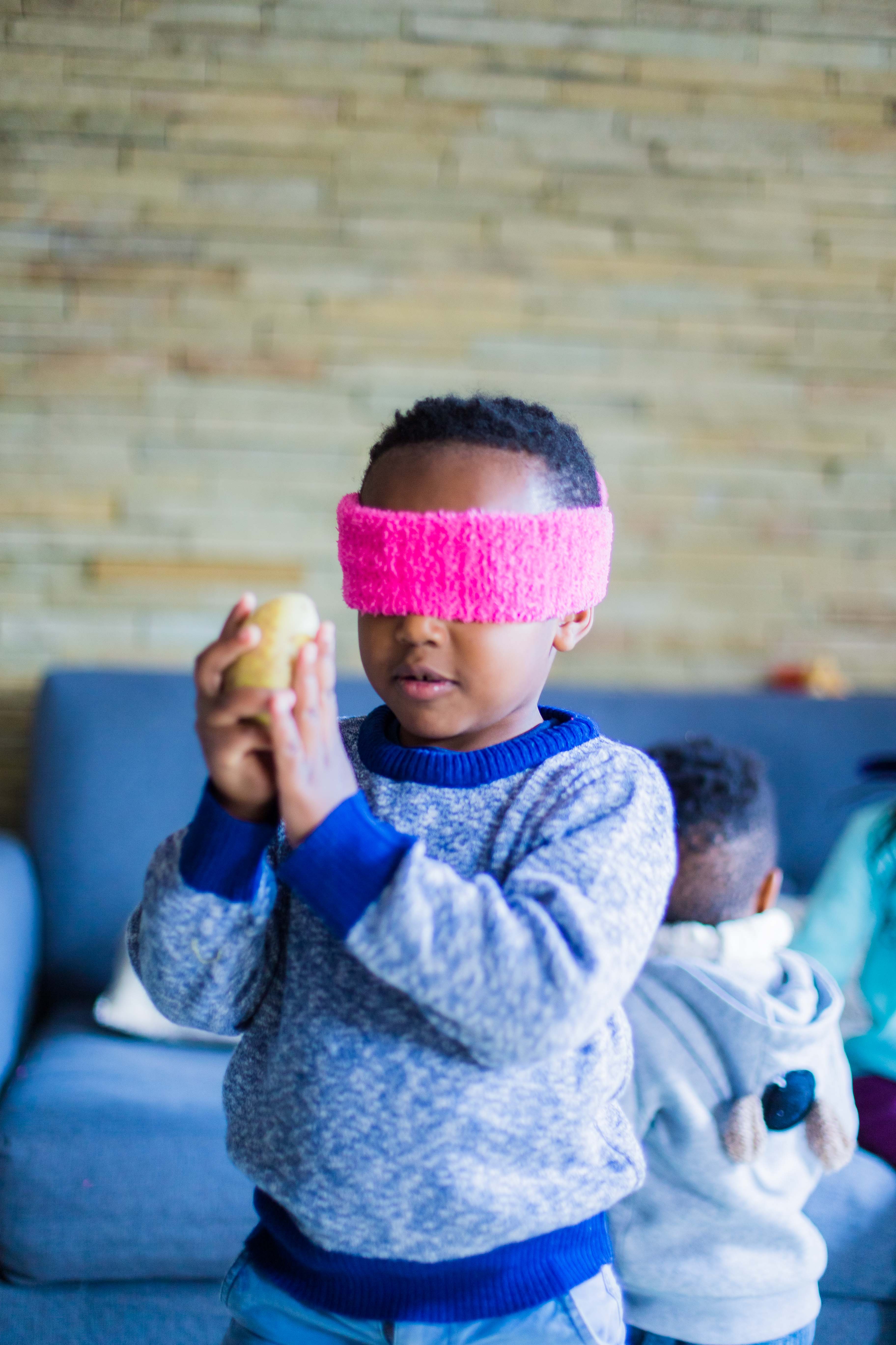 The following day, we played a game focusing on the sense of hearing. I blindfolded them once again, and one of them had to stand in one spot in the room and clap, and the other had to guess and point where the sound was coming from.