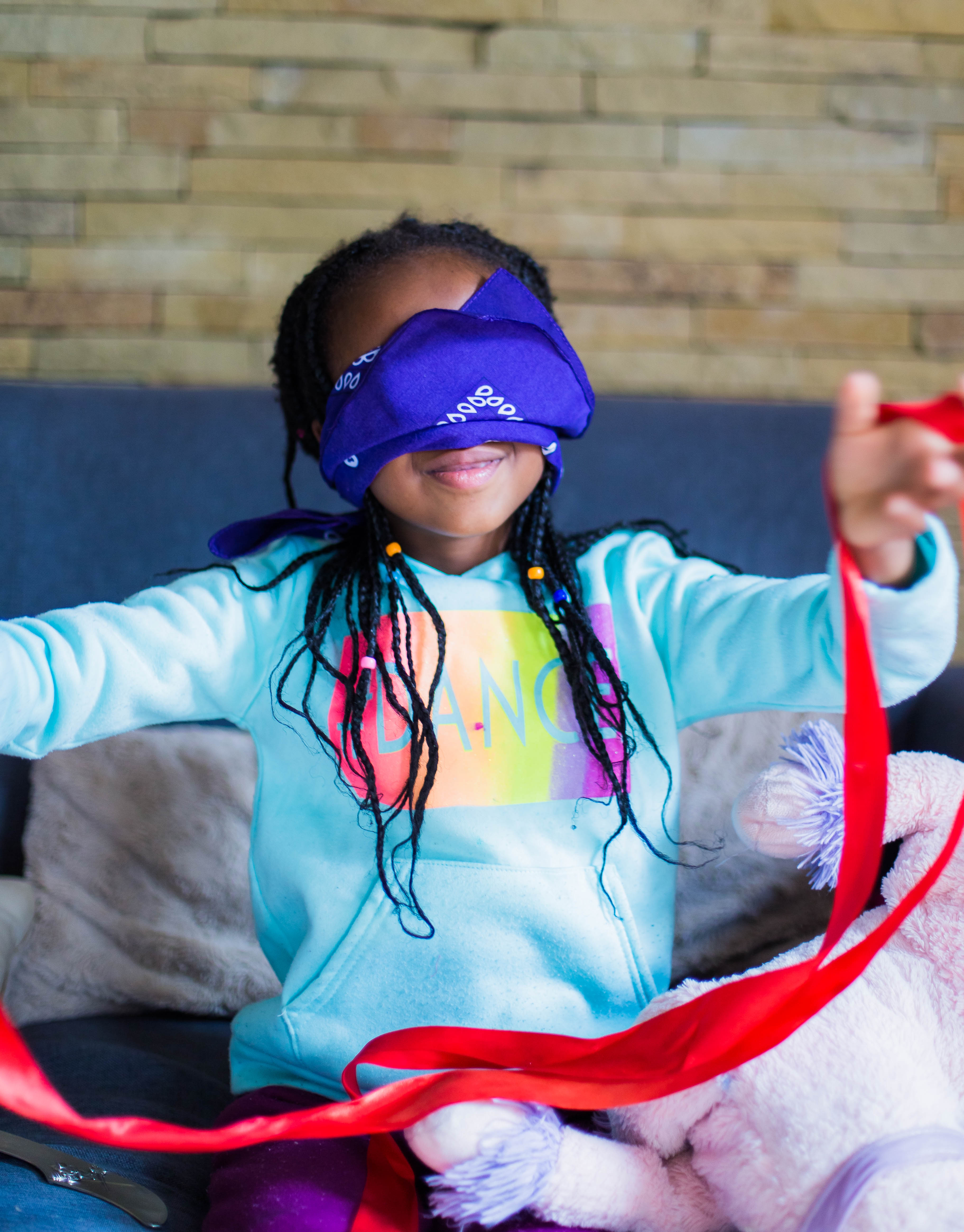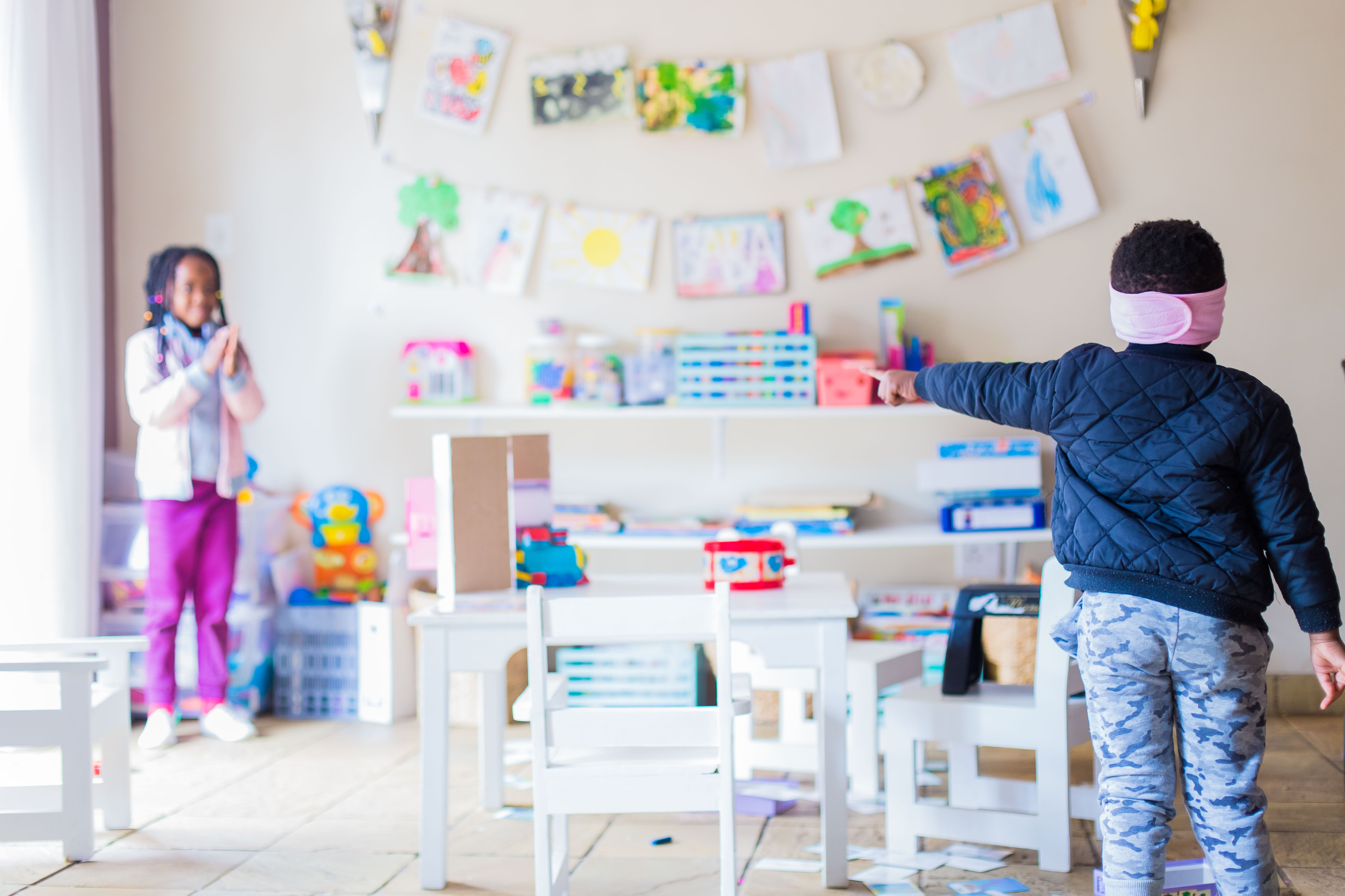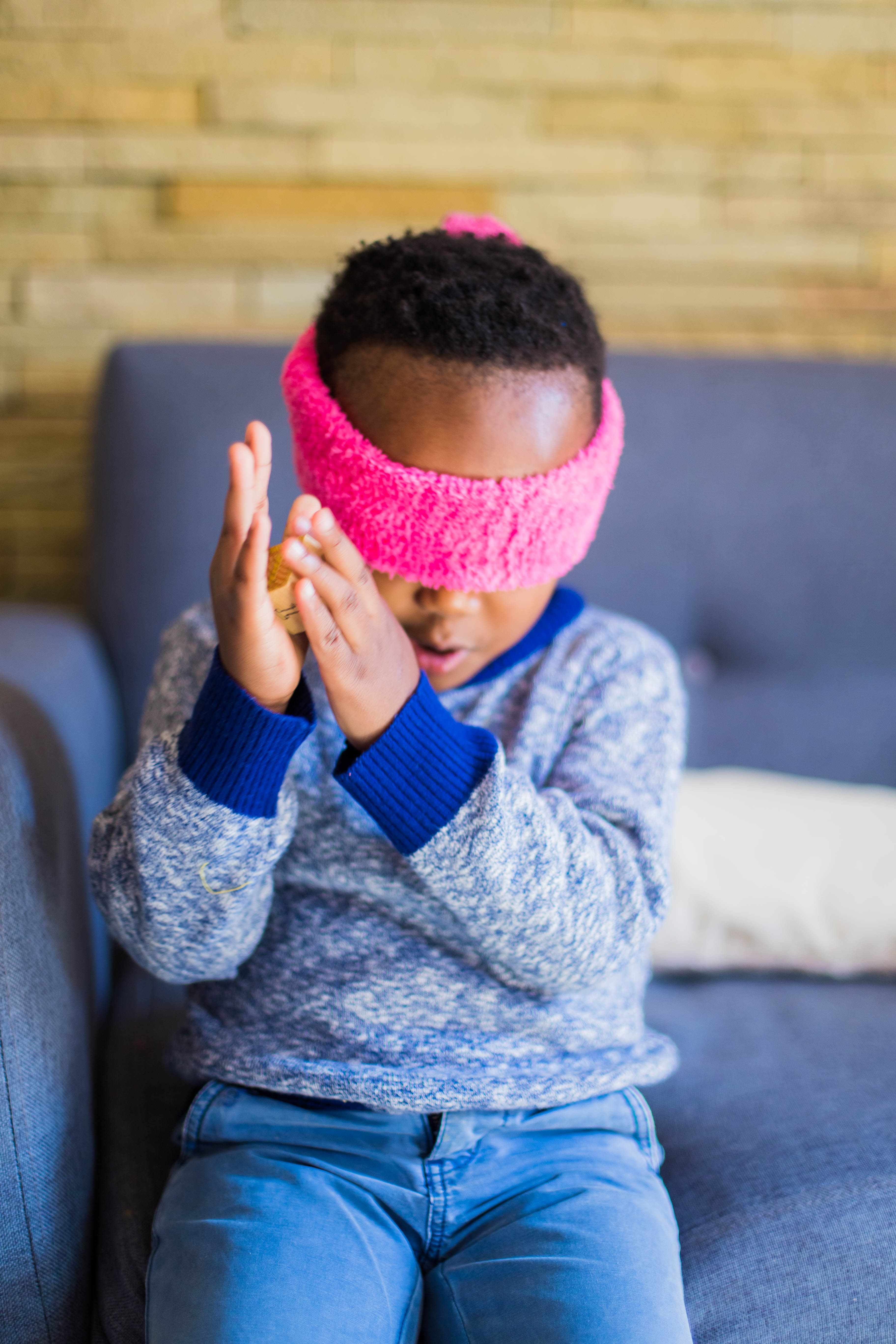 The following day, we played a game focusing on the sense of hearing. I blindfolded them once again, and one of them had to stand in one spot in the room and clap, and the other had to guess and point where the sound was coming from.