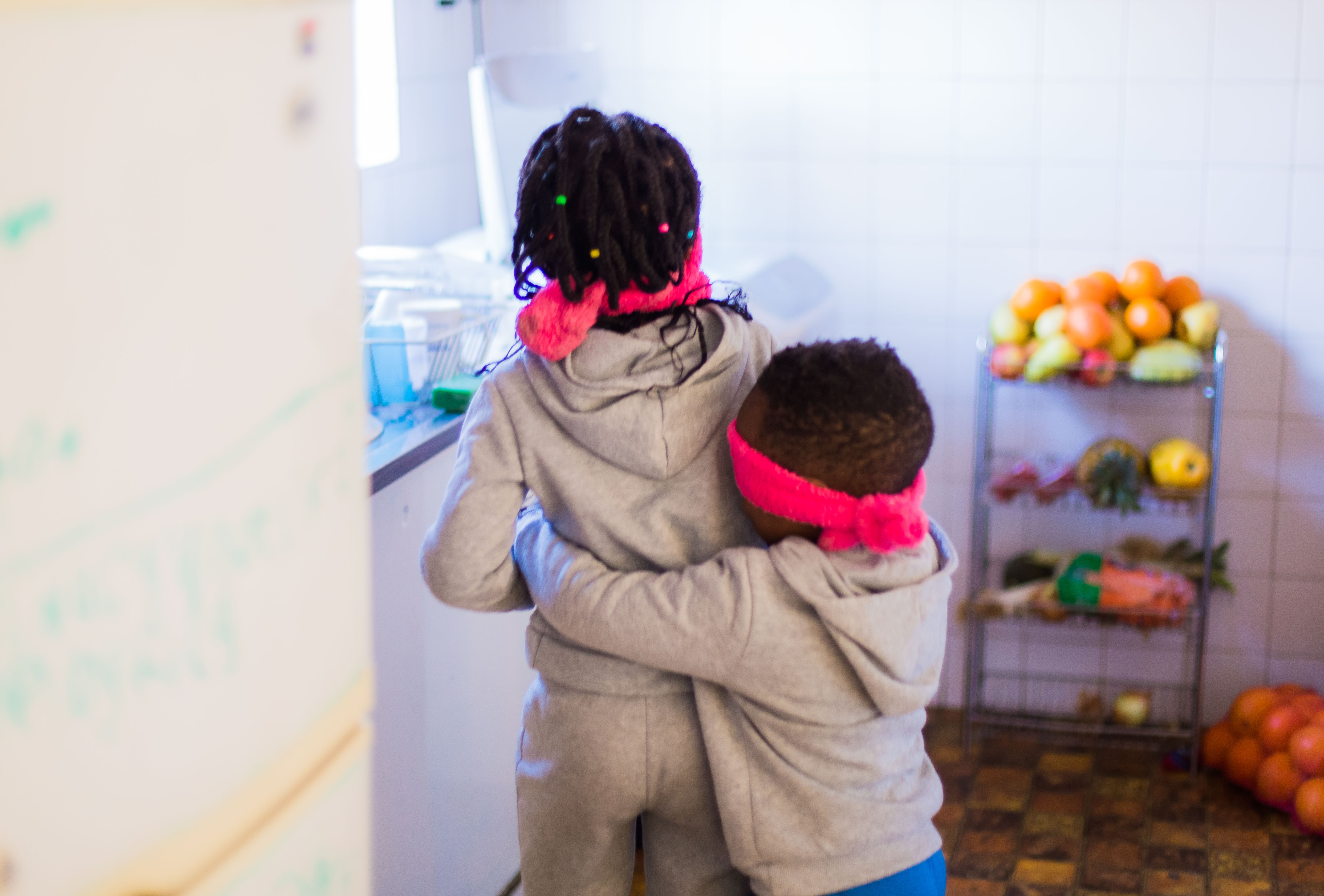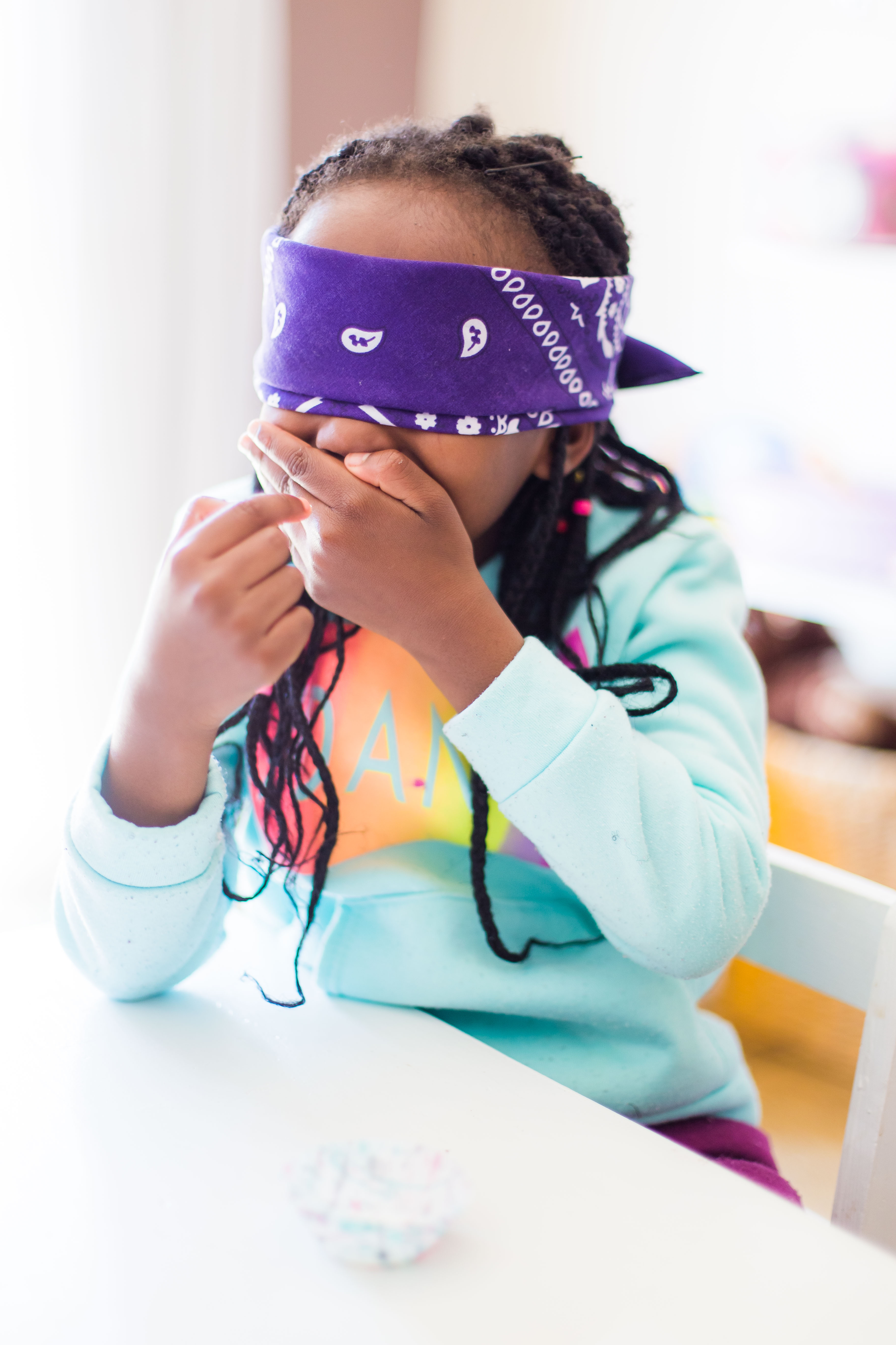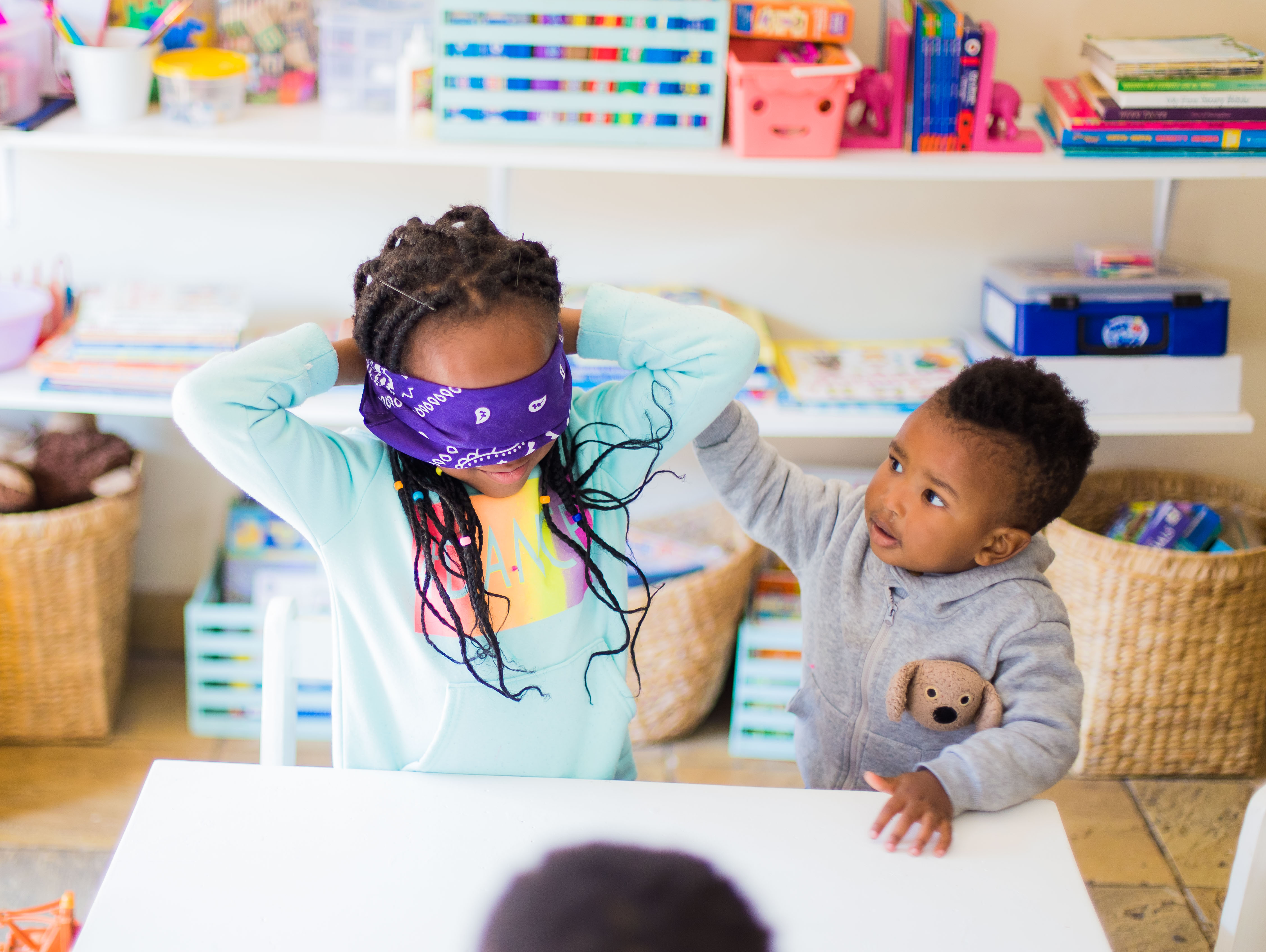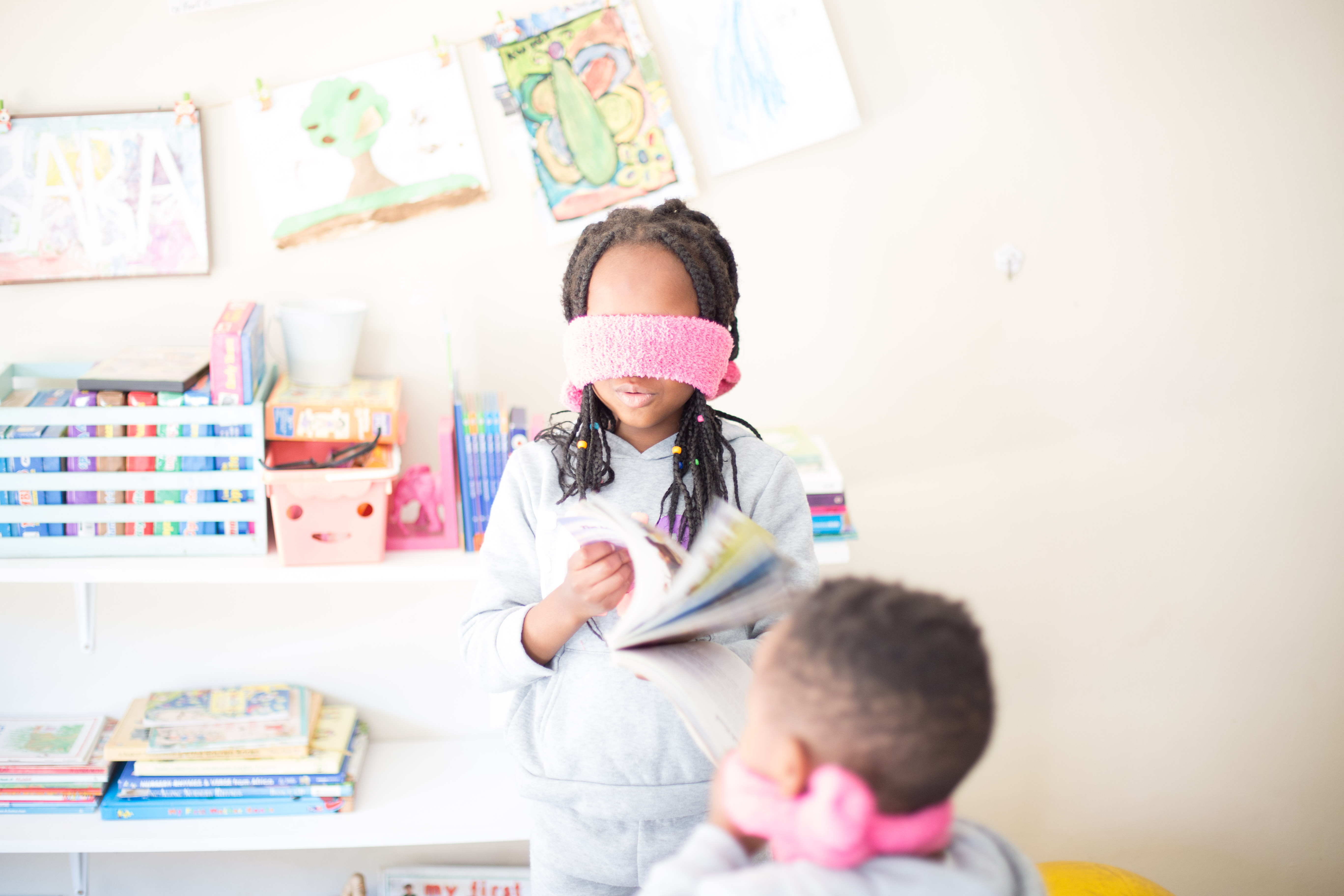 The following day, we played a game focusing on the sense of hearing. I blindfolded them once again, and one of them had to stand in one spot in the room and clap, and the other had to guess and point where the sound was coming from.