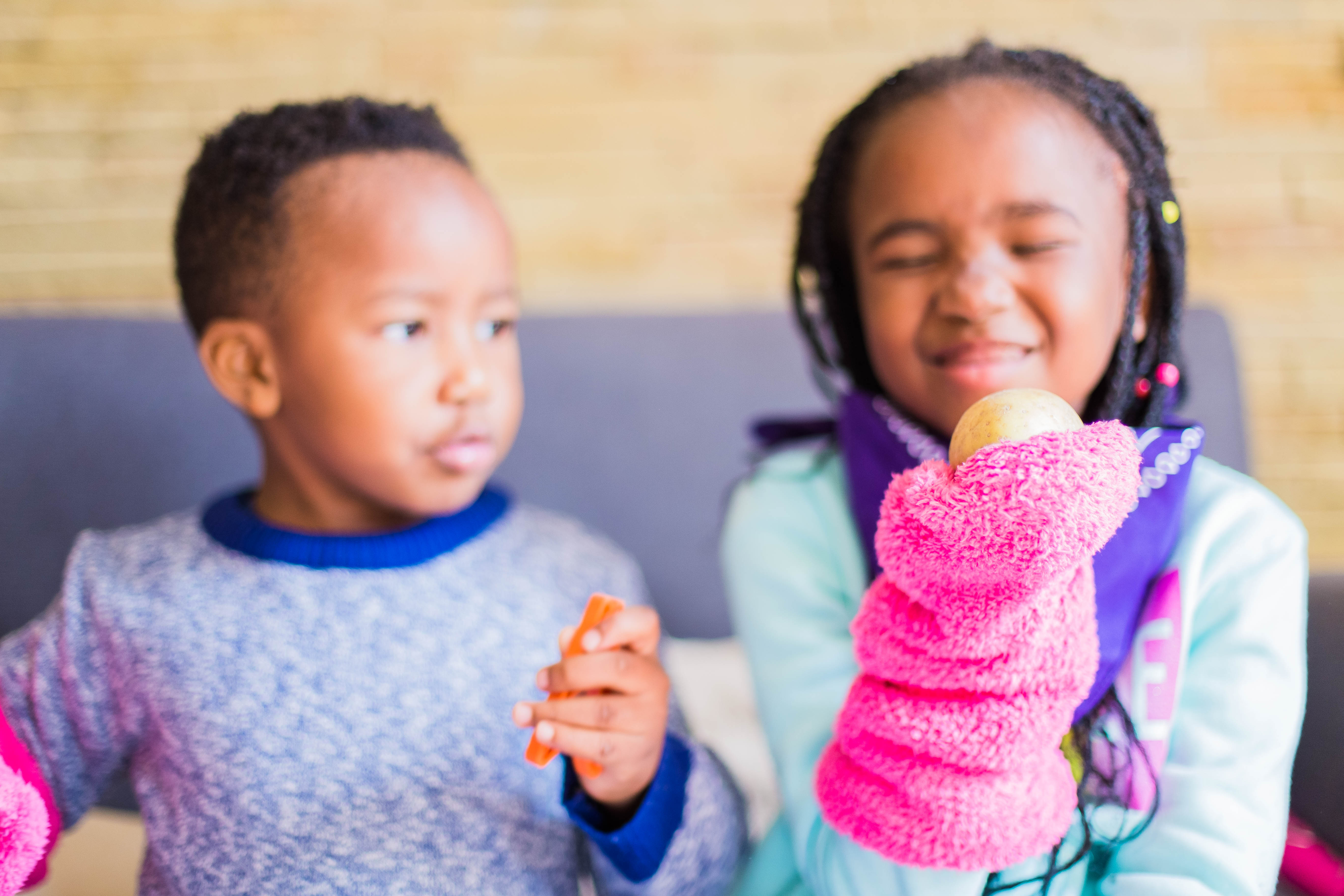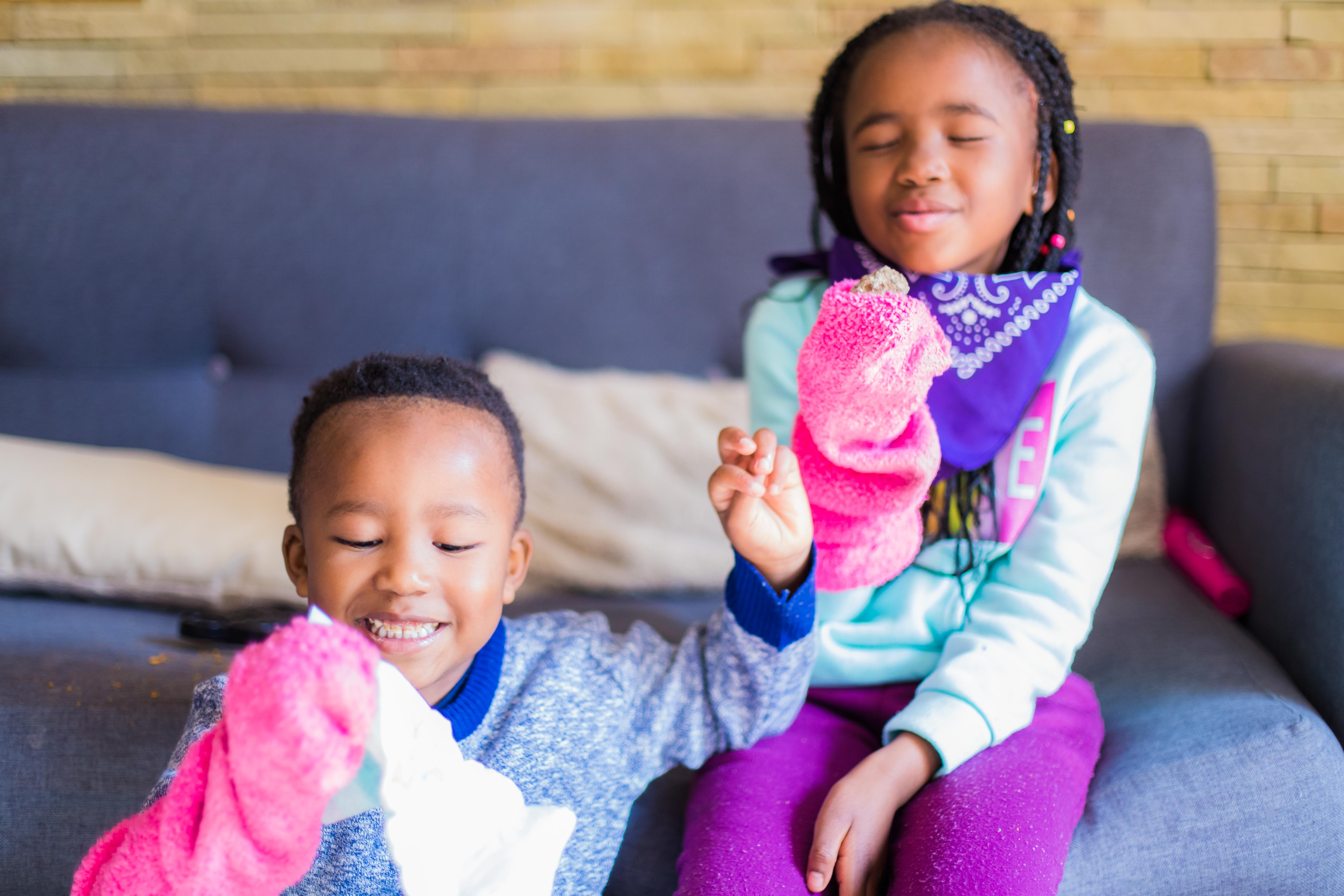After that, to emphasise the importance of the sense of touch and our skin, I put the items back in, and this time they had to put thick socks over their hands, and try to feel the items. And this was definitely more challenging, and we had a lot more peeking …haha!