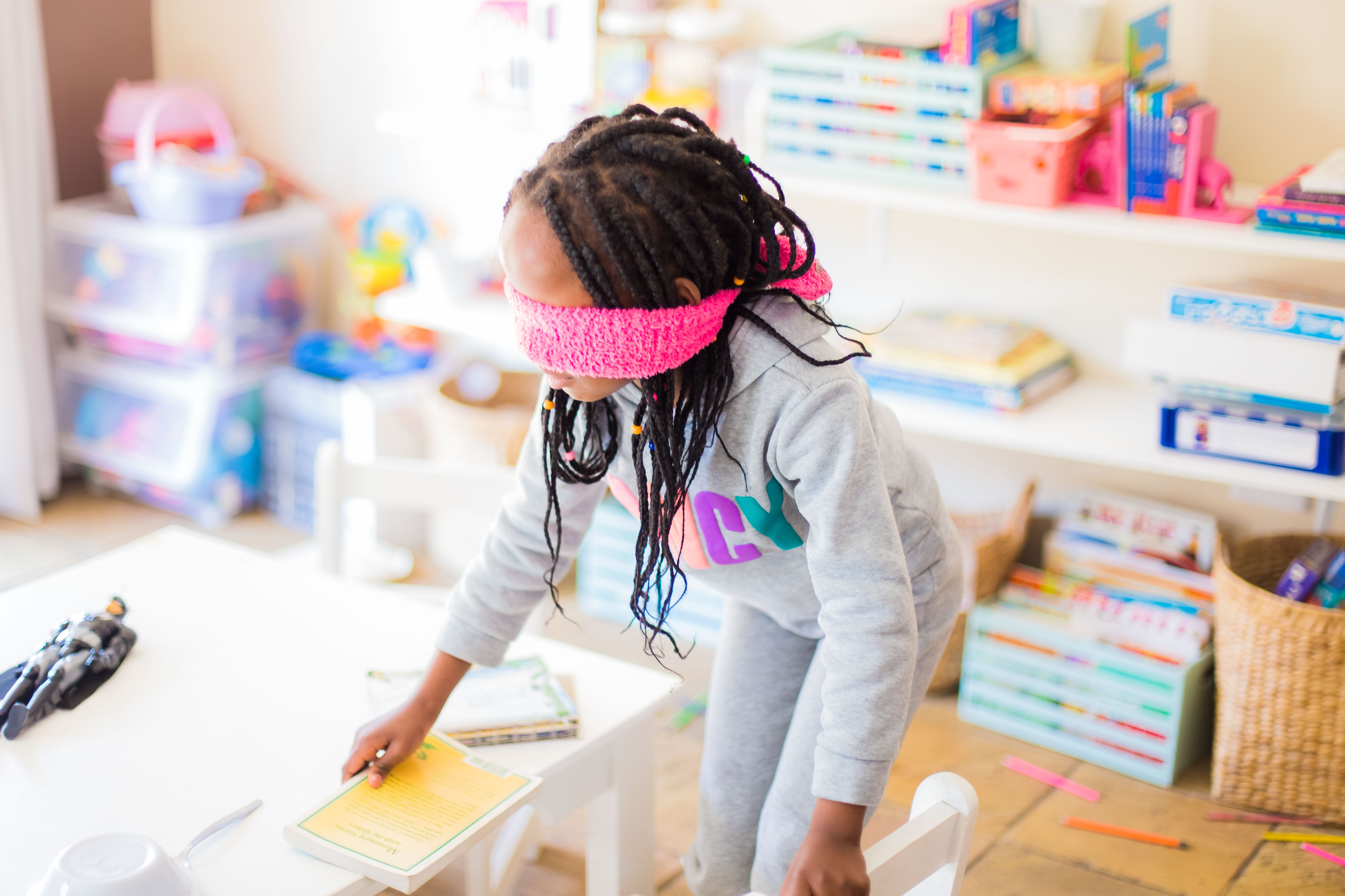 I also asked them to get a book and read it while blindfolded, and then chatted about blind people, guide dogs, braille, etc.