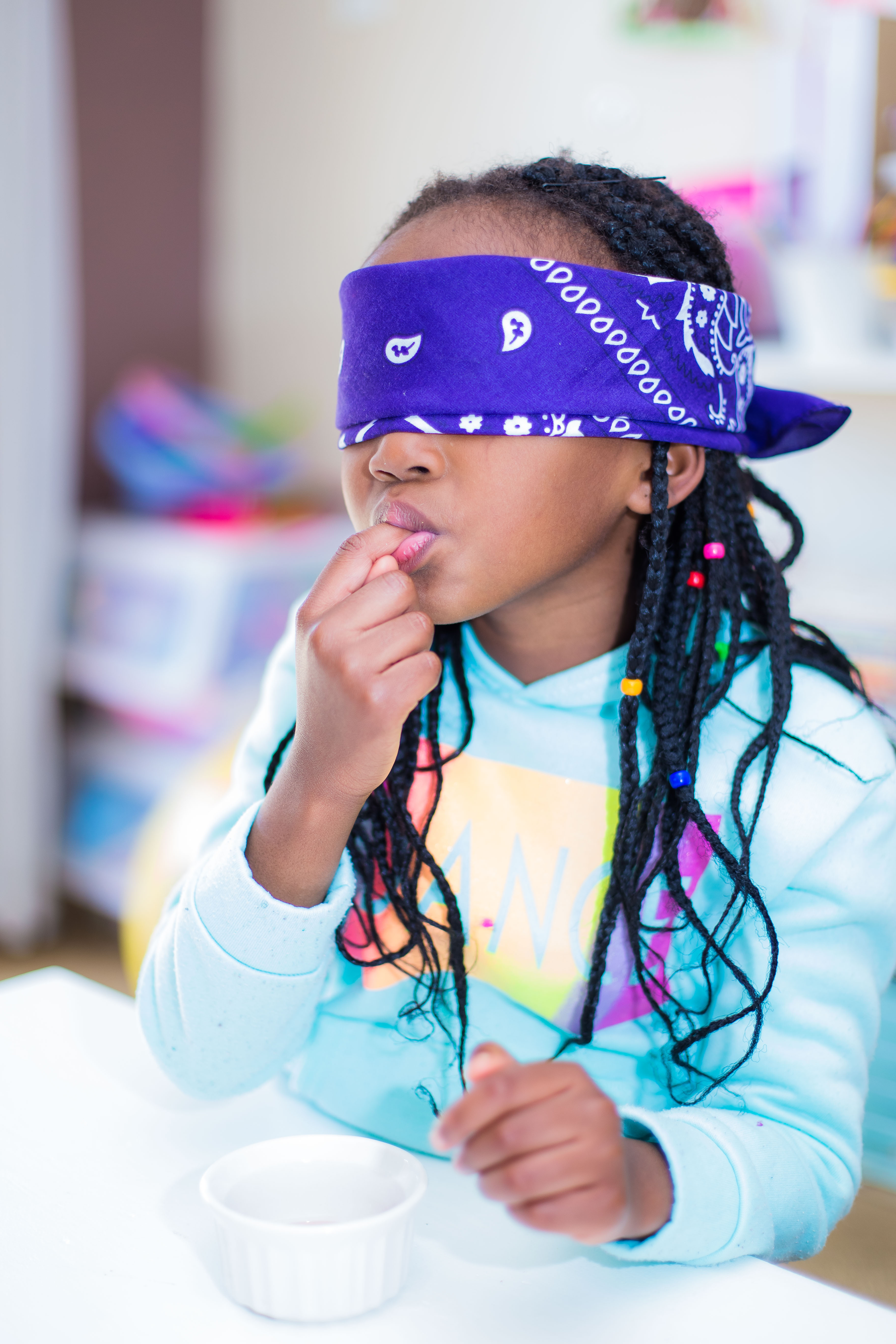 We played a game where I blindfolded the kids and then gave them different foods to taste. They had to 1) guess what they were tasting, and 2) describe the taste (sweet/sour/bitter, etc).I used sugar, salt, lemon, vinegar and muffin crumbs.